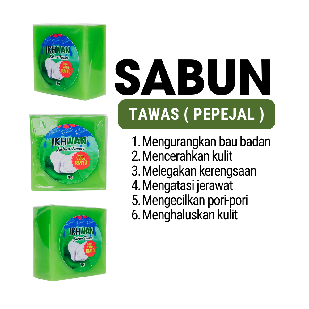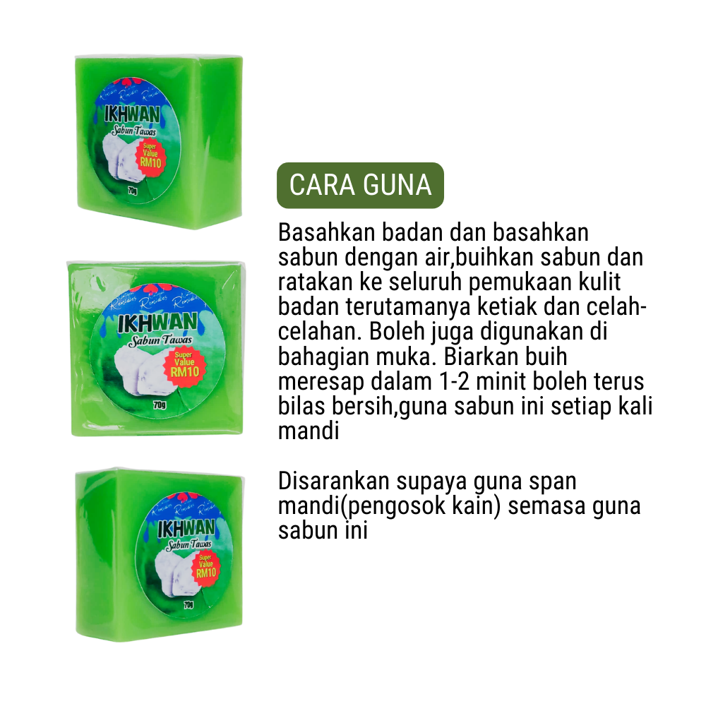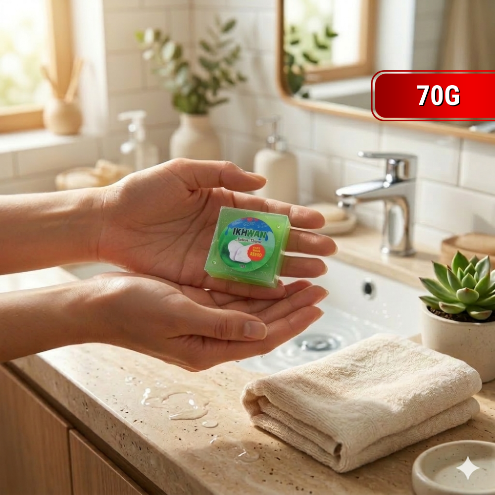 Sabun Tawas Ikhwan merupakan sabun herba pepejal yang diformulasikan khas untuk mengatasi masalah bau badan yang kronik serta mencerahkan tona kulit secara semulajadi. Menggunakan kehebatan mineral tawas asli sebagai bahan utama, sabun ini bertindak membersihkan kulit secara mendalam dan mematikan kuman punca bau tengik. ZMBeautyHQ membawakan sabun ini dalam saiz 70g yang sangat ekonomik, memberikan anda kesegaran yang berpanjangan setiap kali selepas mandi tanpa mengeringkan kulit.